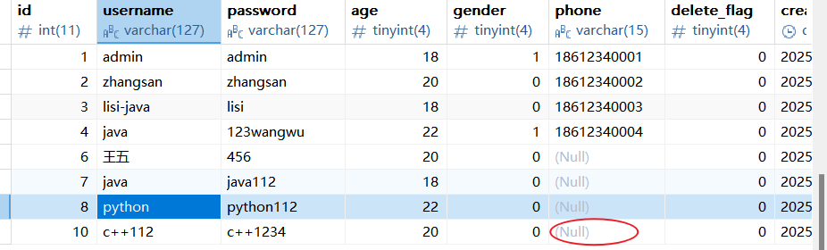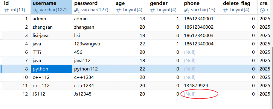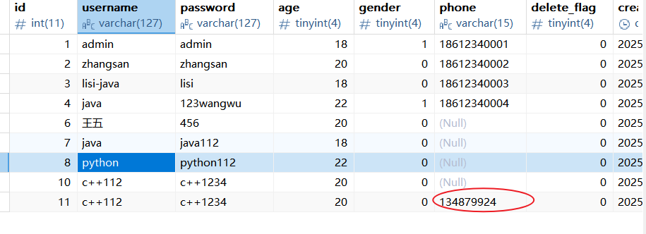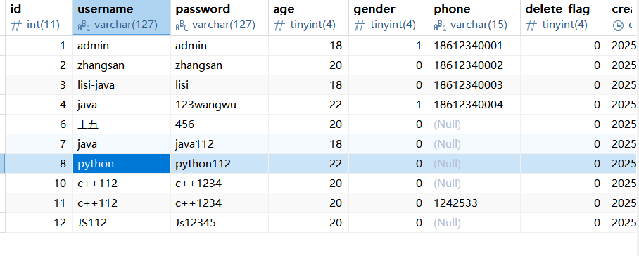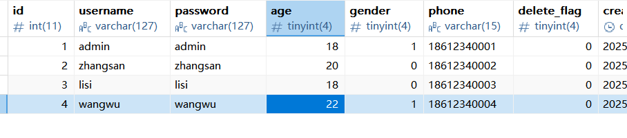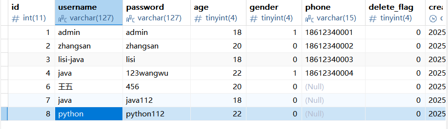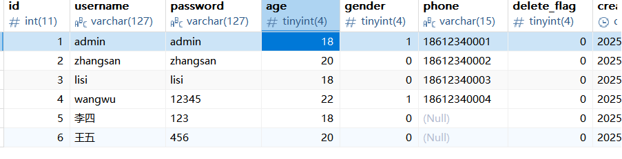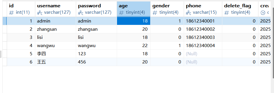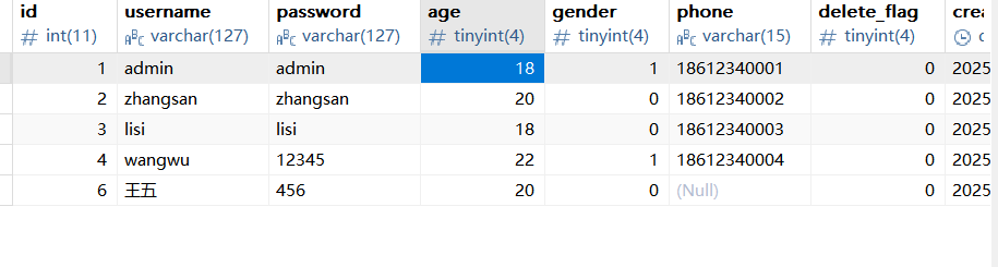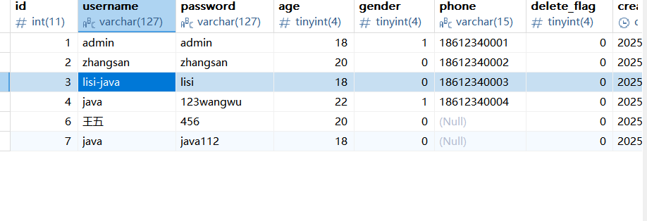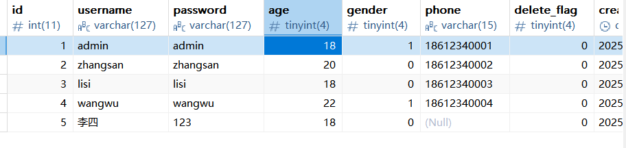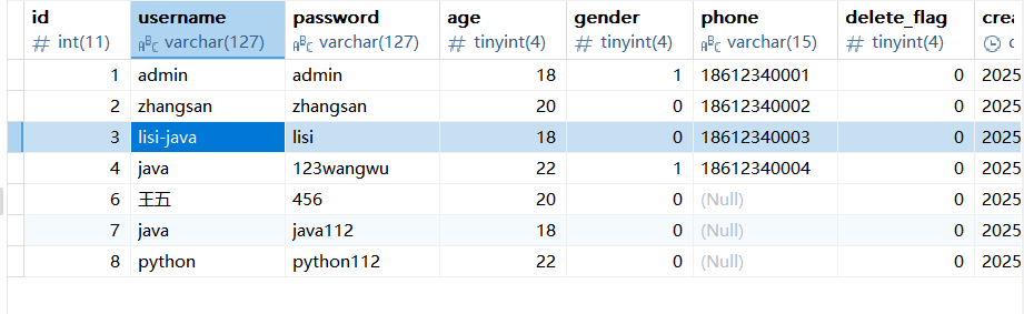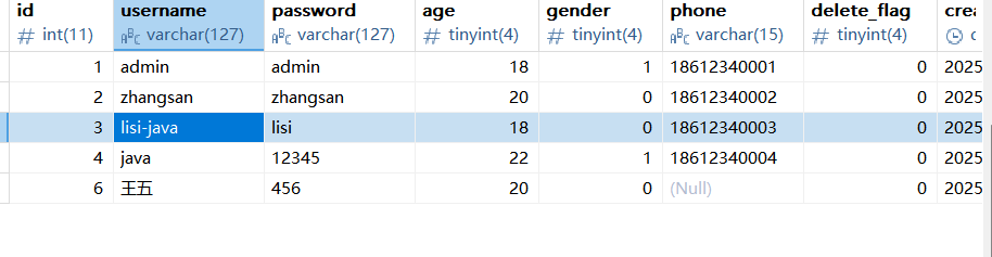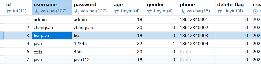 VALUES ('lisi', 'lisi', 18, 1, '18612340003');