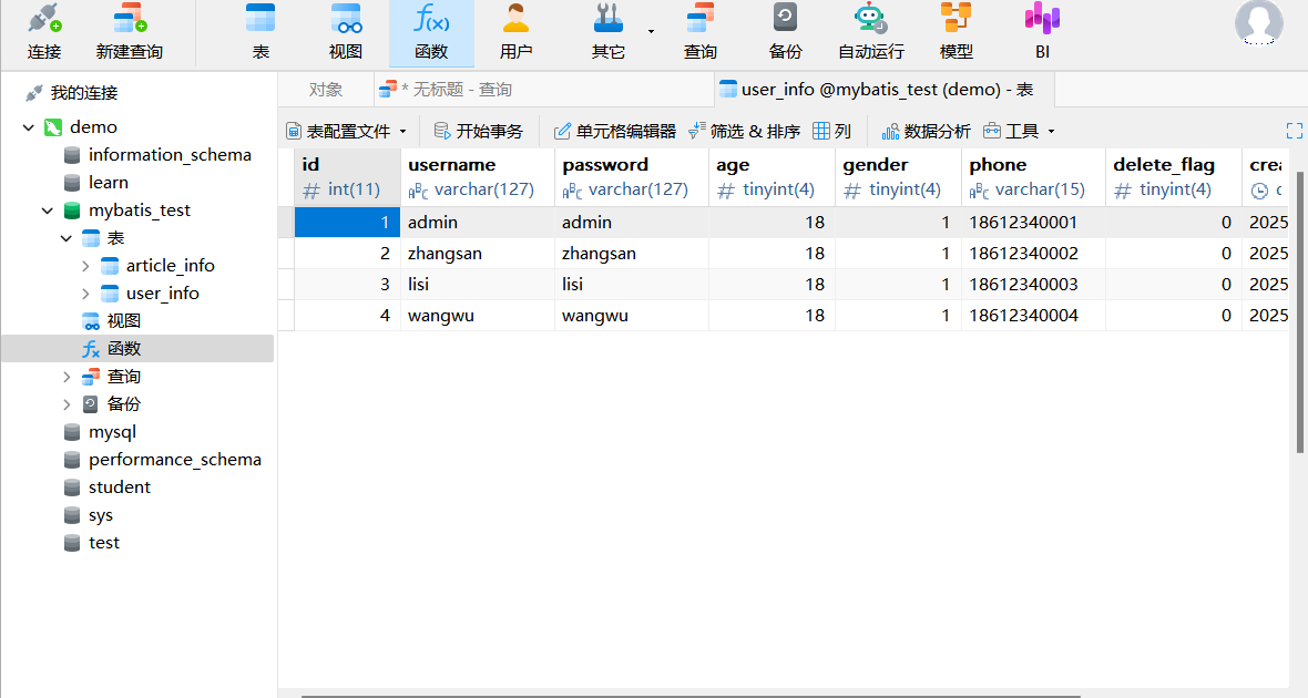 VALUES ('wangwu', 'wangwu', 18, 1, '18612340004');这里,小编使用的是navicat客户端(文章最后会介绍)