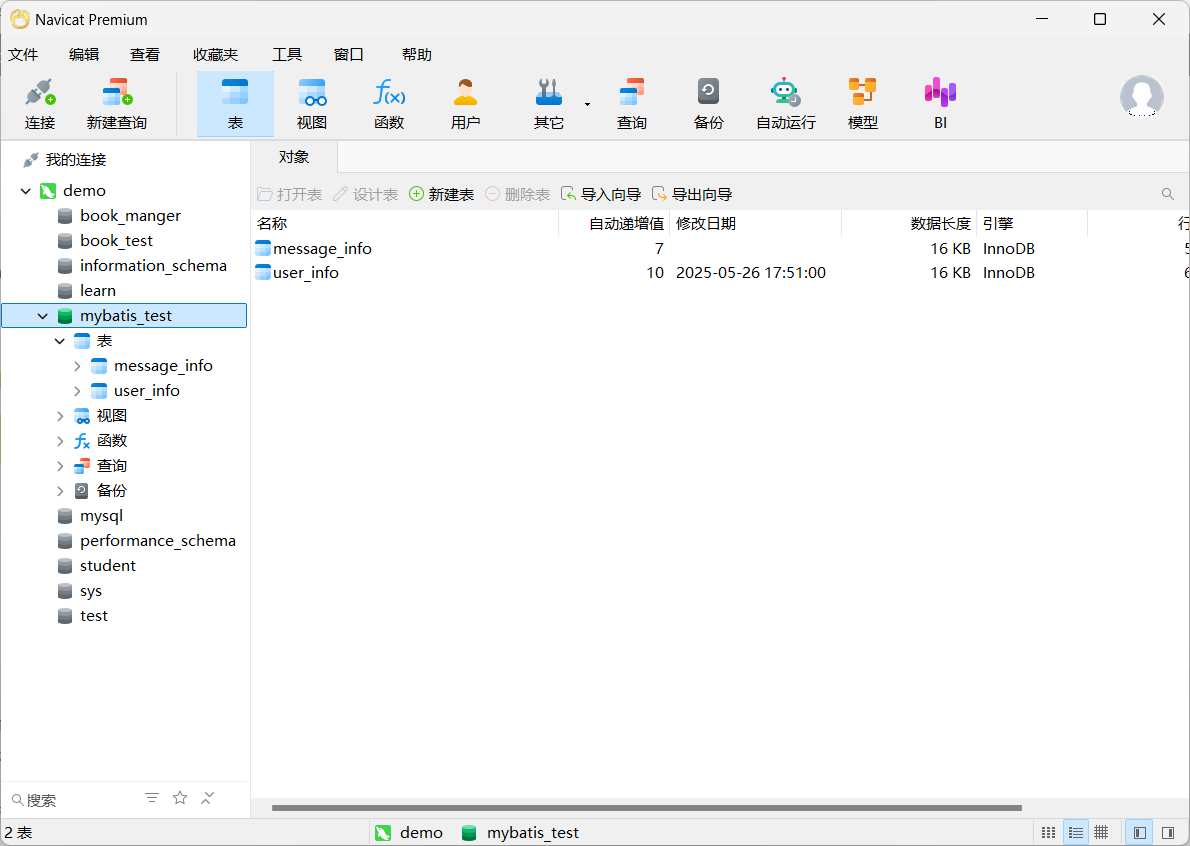 右键demo可以创建数据库,点击数据库下的表,右键它可以创建表。