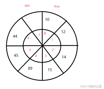 我们舍弃一个空间,利用这条公式,举个例子,当我们的last走到7了,然后+1模上数组长度,等于了0,所以相当于回到了0下标,就代表了是满的。